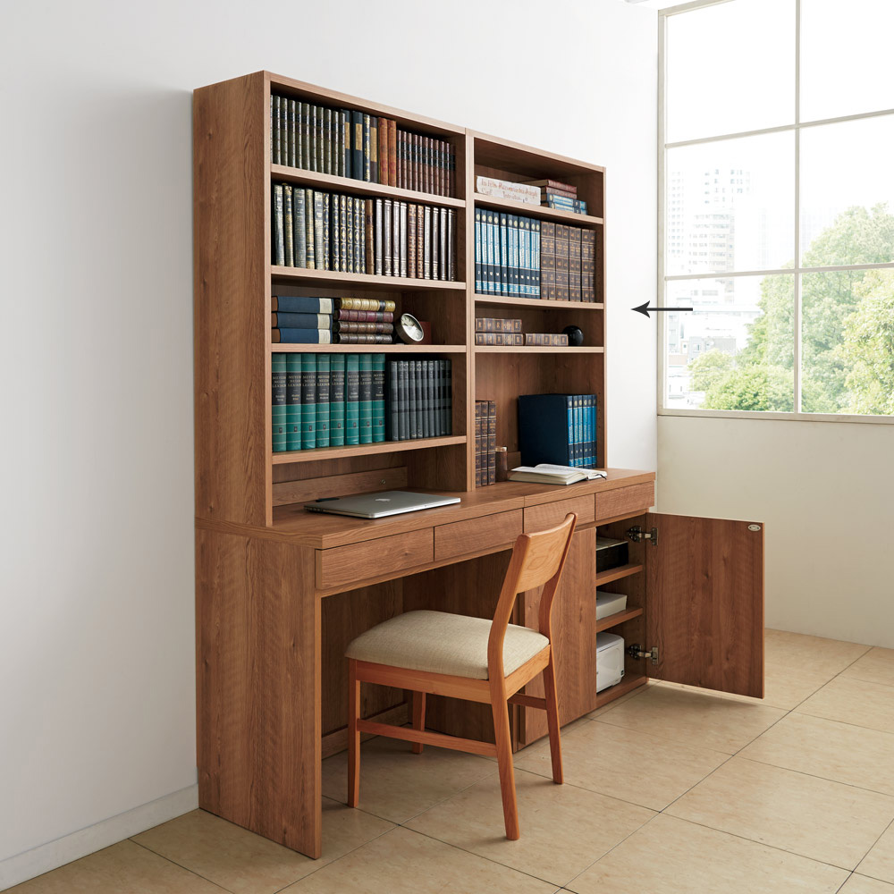 [国産]海外の図書館のような空間を叶えるブックシェルフ付き、デスクキャビネットシリーズ。棚板は鉄芯入りの頑丈設計で、耐荷重約30kg!北欧調のお部屋とも相性がいい優しい天然木調が魅力。毎日使うものだから、配線のしやすさや収納しやすさなど、こまやかな機能までこだわりました。シリーズで揃えて、壁面収納のワークスペースが完成します。上下ジョイントするだけですぐに使えるので、女性でも安心です。