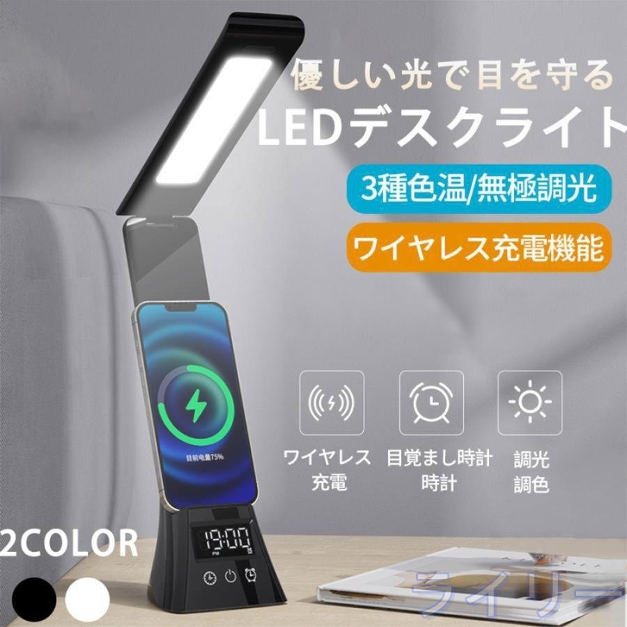 ■デスクライト LED 学習机 目覚まし時計 ワイヤレススマホ充電 USB出力 三段階調色 無段階調光 電気スタンド 卓上ライト 目に優しい 高輝