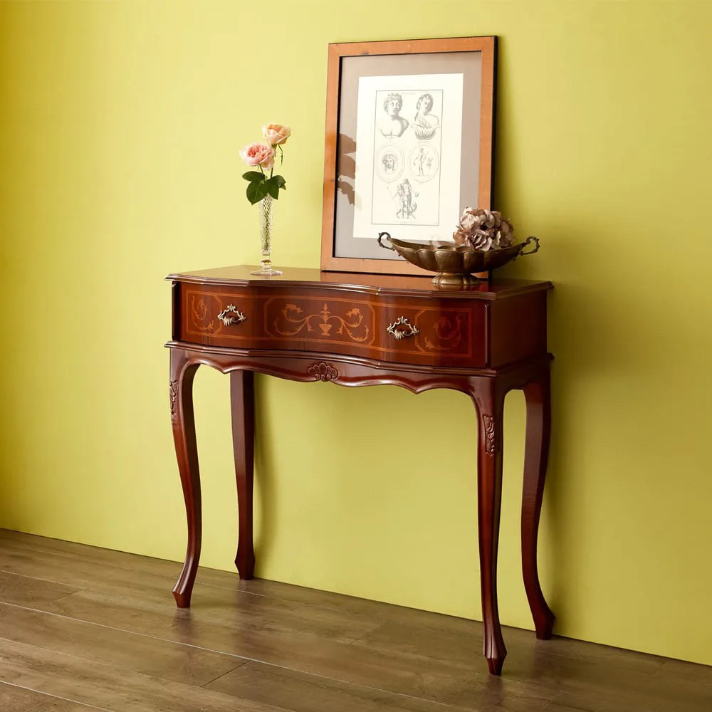 ヨーロッパの職人が現代に受け継いでいる、精緻な技と美の結晶の象嵌細工を前面に施した、格調高いリビング収納の猫脚コンソールデスク。イタリア高級家具として人気の猫脚シリーズです。クラシック家具の流麗なフォルムが、外国のような格調高く上質なインテリアを演出します。