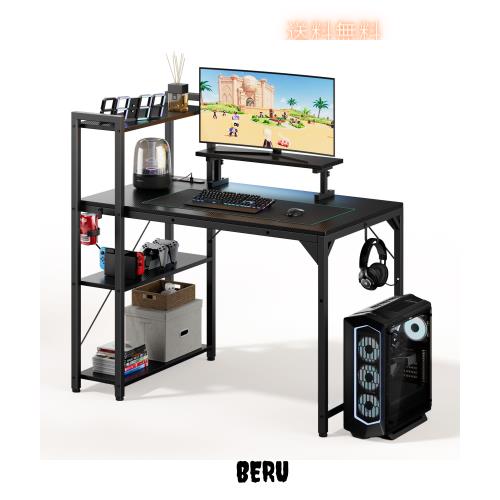 ■DOMICON パソコンデスク 黒 幅107cm 棚付き コンセント付き ゲーミングデスク 収納 モニター台付き pcデスク オフィスデスク 学習机 作業