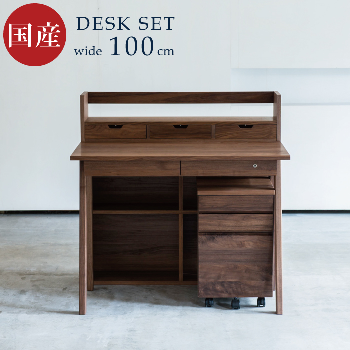 ■無垢材を使用した国産デスクのご紹介です。■デスク・引き出しには鍵がついております。■ワゴン・A4リングファイル収納可能です。■シェルフ・棚板は固定式です。可動式とくらべると、頑丈で壊れにくいため安心してお使いいただけます。■塗装・塗装には、木の呼吸を妨げず、体に有害な成分を含まない、植物由来の自然系オイルのみを使用。 【主素材】天然木ウォールナット材・プリント化粧繊維板 (引き出し内部):国産天然木ヒノキ材・4mmシナ合板塗装:オイル仕上げ 【寸法】デスク:幅100×奥行き53×高さ74cmシェルフ:幅100×奥行き23.5×高さ97cmワゴン:幅36×奥行き44×高さ56.3cm