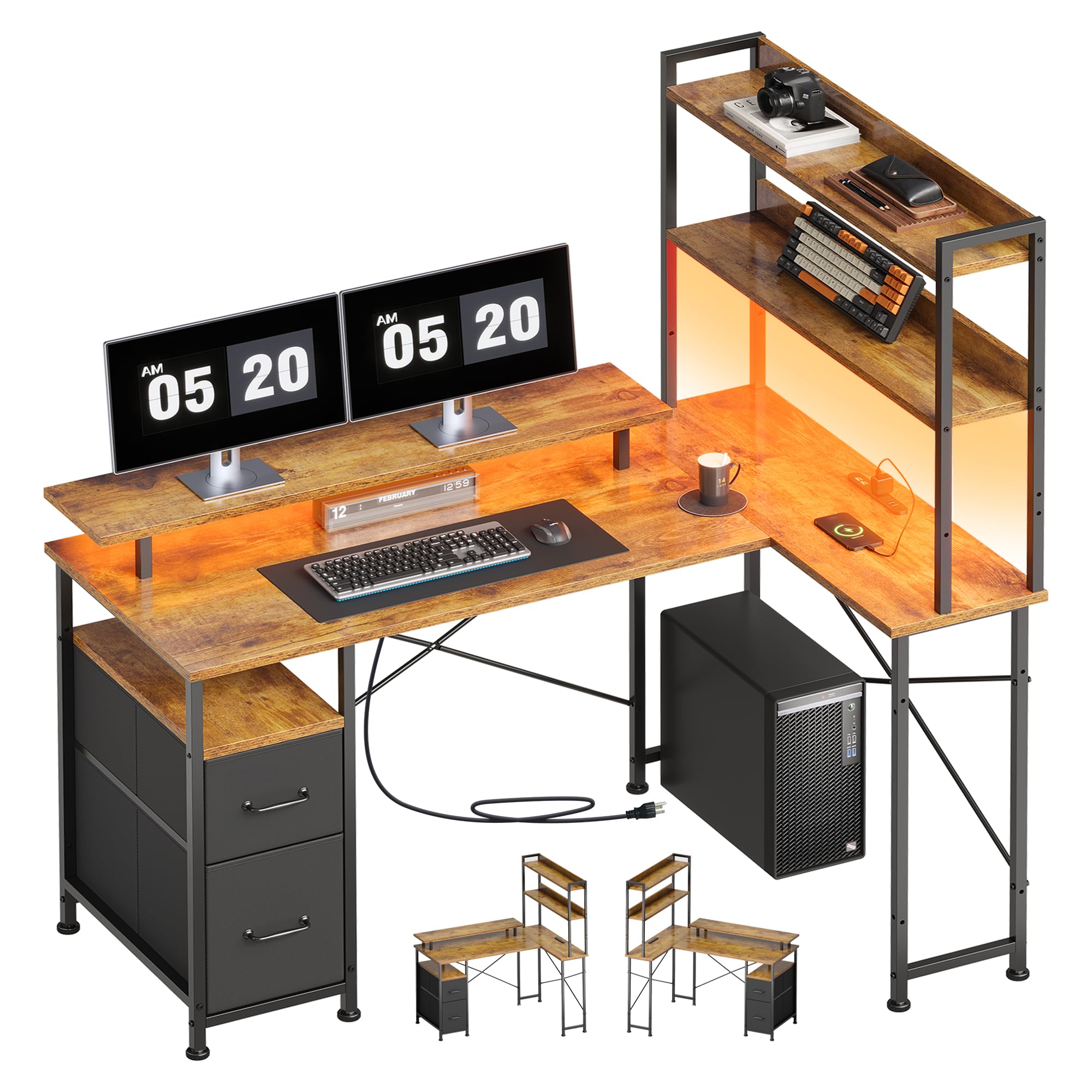 ■Maihail l字デスク LEDライト付き 机 pcデスク desk ?子 パソコンデスク コンパクト 家具 table 学習机 引き出し付き 上収納棚付き ワー