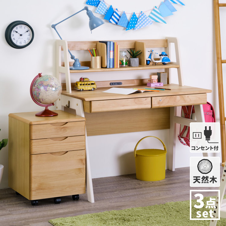 ■【12/23限定!ポイント10倍!】 3点セット 学習机 学習デスク 勉強机 つくえ 机 デスクセット ワゴン キャスター 上棚 棚 鍵付き コンセ