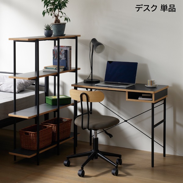 落ち着いた木目調天板に淡いブラックのフレームを合わせたモダンなデスク。二人で使用することもできる幅140cm。左右非対称にデザインしたフレームは左右どちらにも組み付けることが可能です。フックのついたフレームは掛けたカバンがゆらゆらしない様にフレーム数を増やしてあります。大きな開口部の有るフレームはラックを連結した際にモノが取り出しやすく、すっきりデザインされています。天板中央にはコード用ホールがあり、配線がしやすい仕様になっています。ボード面には傷や熱、汚れに強いメラミン化粧板を採用することでお手入れも簡単。同シリーズのラックやワゴンと揃えても◎