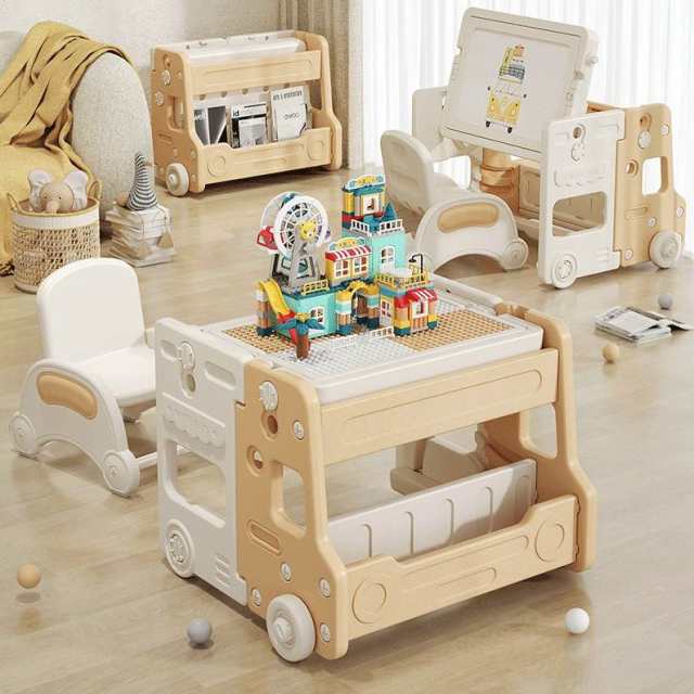 2点セット 子供デスクセット キッズデスク チェア 学習机セット 多機能 ブロックテーブル お絵かきボード ホワイトボード キッズテーブル 可愛い バス形 入園 お祝い