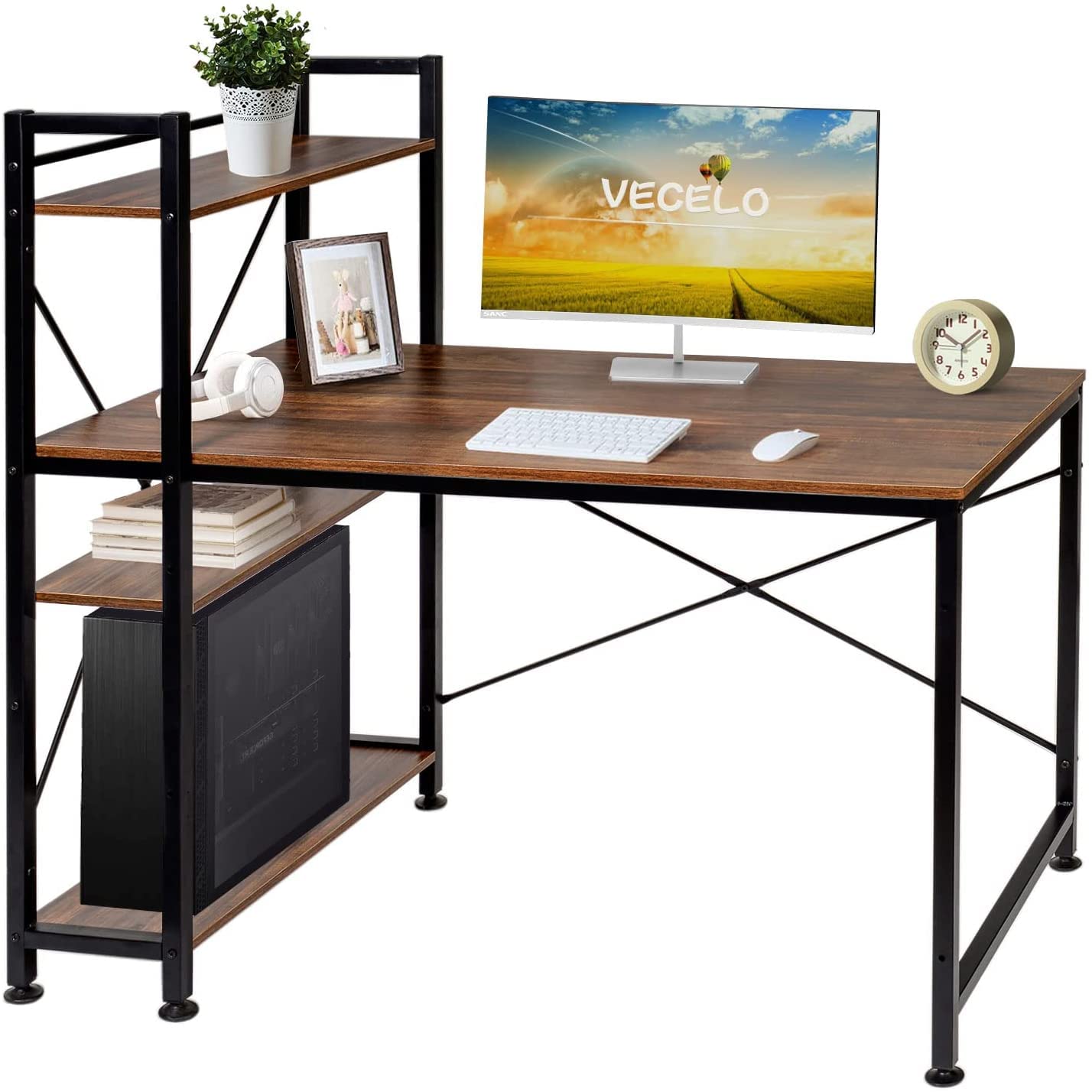 ■VECELO デスク パソコンデスク 机 PCデスク ラック付き(A4対応) コーヒーブラウン 在宅ワークデスク 勉強机 学習机 オフィスデスク ゲー