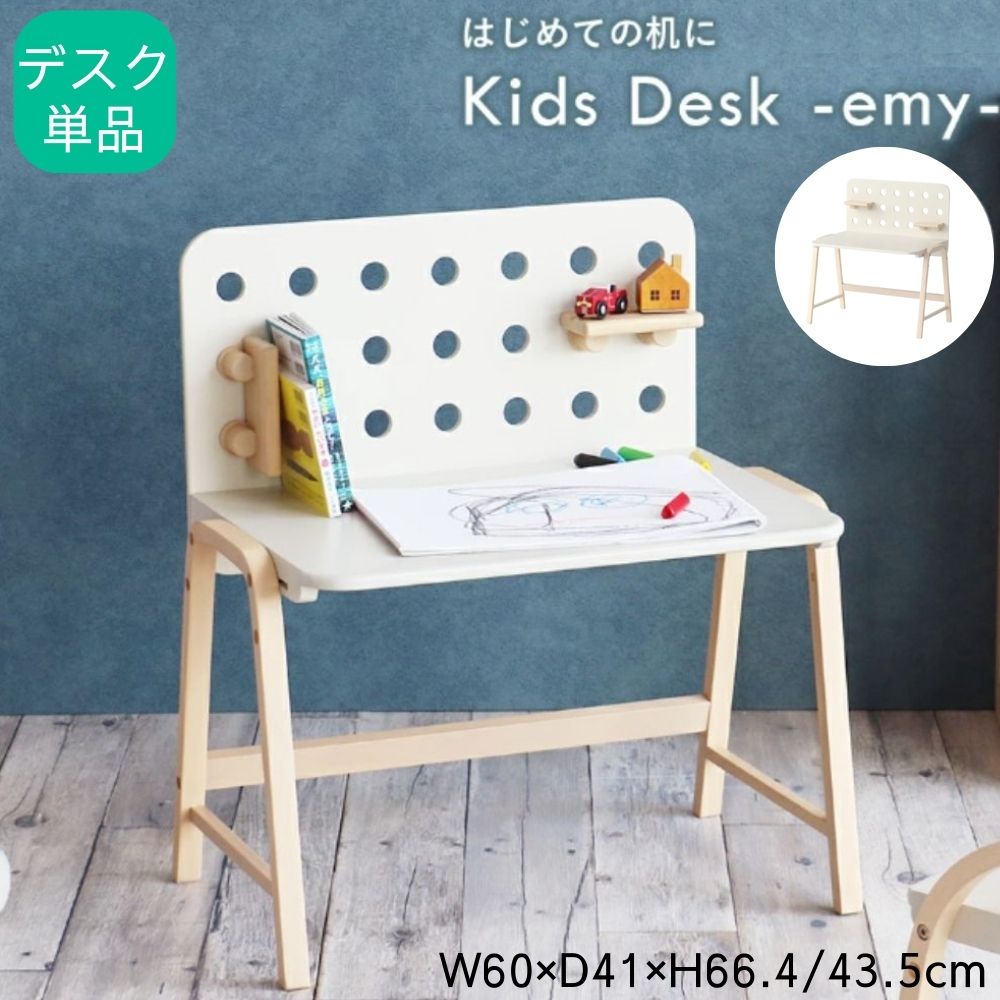 子どもの"はじめての机"にぴったりなデスクです。 リビングに置いても窮屈に感じないサイズです。 高さは2段階で調整可能 付属の棚板は手でクルクルと回して付け替えできる木製ボルトで固定します。 別売りの"kids arm chair -amy-"を揃えて使うのがおすすめ! 軽量なので、リビングや子ども部屋などへ持ち運ぶのも簡単です。 天板や有孔ボードの角は丸みをもたせた安全な設計になっています。 商品サイズ:W600×D410×H664/435mm 商品重量:約5.6kg 材質:天板・有孔ボード/繊維板、天然木(ラバーウッド材) フレーム/天然木化粧合板(ラバーウッド材) 棚板/天然木(ラバーウッド材) 塗料:ラッカー塗装 耐荷重:天板/15.0kg、 棚板/0.6kg 備考:組立品(約15分) ※基本送料無料(沖縄県・北海道・一部地域・離島等の条件によりましては別途送料が必要となります。) 関連キーワード(本商品の説明ではございません) かわいい おすすめ 人気 キッズテーブル お絵かき机 シンプル ナチュラル 2歳 3歳 4歳