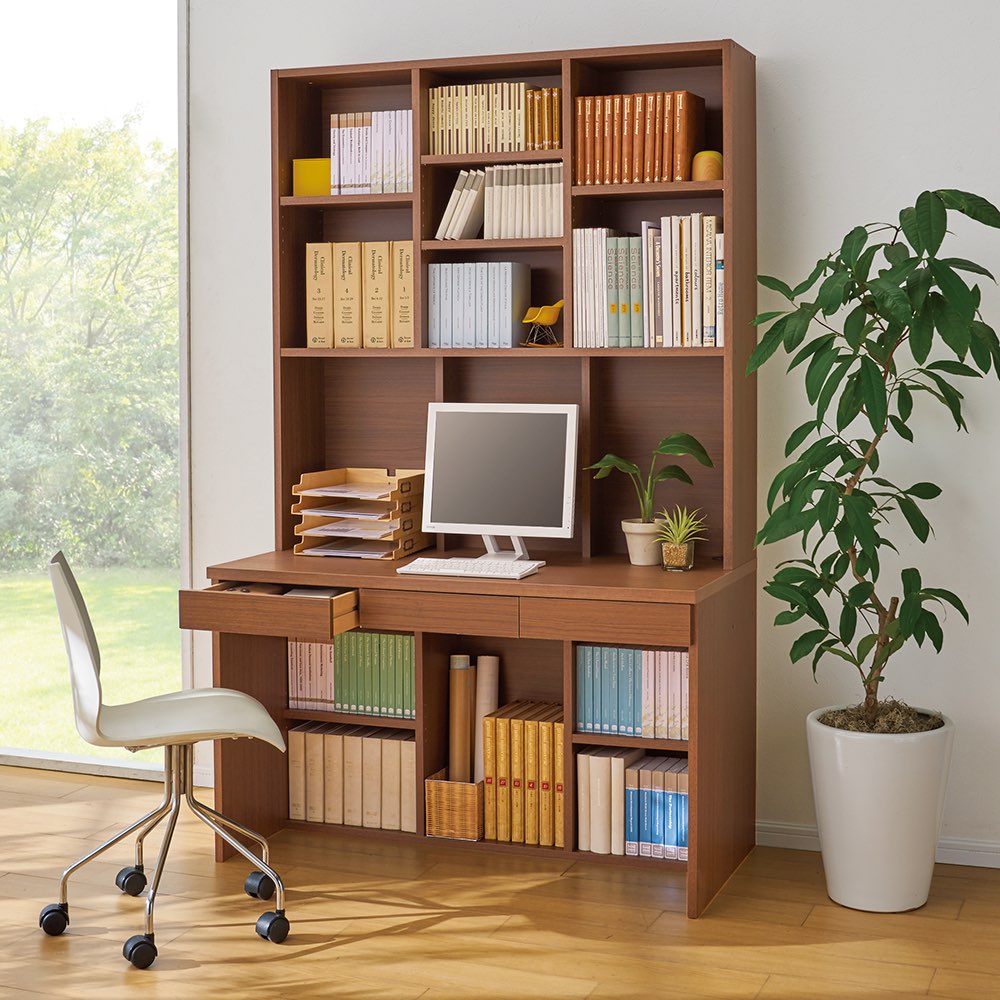 ファイルや資料を壁一面に大量収納!広いデスクトップとたっぷりの収納で、本格的なオフィス空間を自宅に実現。趣味も仕事もじっくりできる本棚一体型デスクです。テレワーク・リモートワークにもおすすめです。