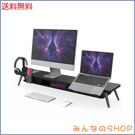 ◆商品名:Fenge モニター台 卓上 机上台パソコン台 108cm横幅 2段 木製天板 アルミニウム製脚 ノートパソコンスタンド付き スマホ置き付き デスク