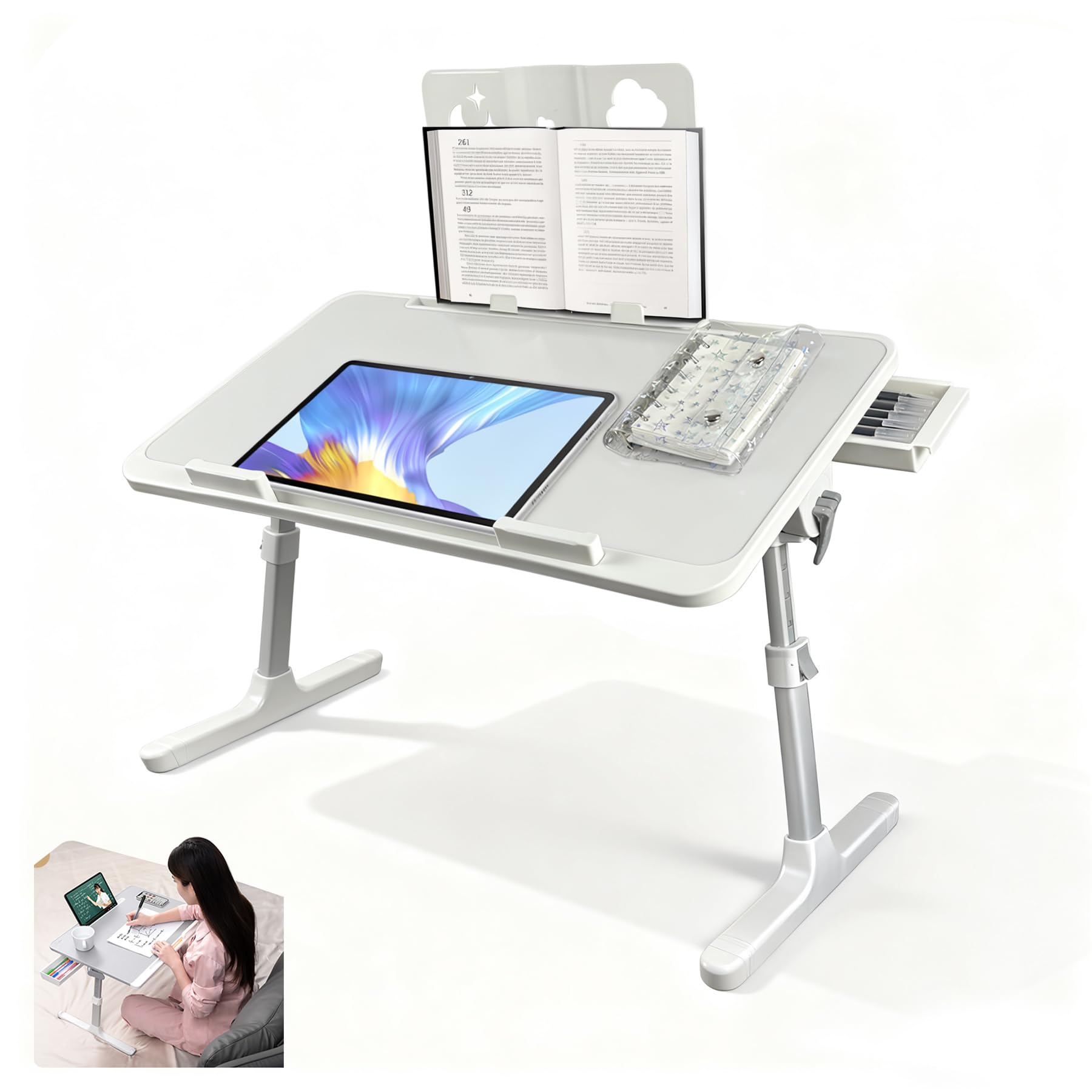 ◆商品名:WSKLY(ワスクリ) ベッド デスク ラップデスク 折りたたみテーブル ちゃぶ台 大容量天板 角度 高さ調整 引き出し ブックスタンド付き 45kg