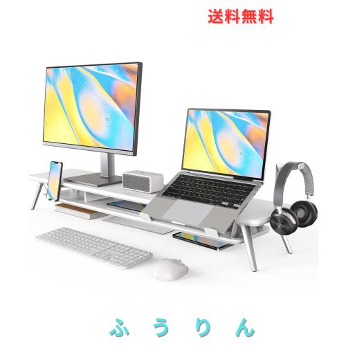 ◆商品名:Fenge モニター台 卓上 机上台パソコン台 108cm横幅 2段 木製天板 アルミニウム製脚 ノートパソコンスタンド付き スマホ置き付き デスク