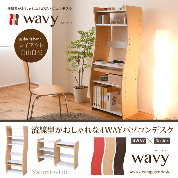 [サイズ][外寸](縦置き)幅60×奥行41×高さ150cm[内寸](スライド棚)幅50×奥行23.5×高さ5.5cm(スライド引き幅)14.5cm(可動棚)幅56×奥行29.5×厚み1.8cm(6.4cmピッチ22穴)収納量・耐荷重[天板]約25kg以下[スライド棚]約5kg以下[棚板]各約15kg以下梱包サイズ(cm)幅(横)×奥行(縦)×高さ:94.5×48.5×16.5梱包重量(?) :18.4[素材][本体]プリント紙化粧繊維板[側板・スライド前板]合成樹脂化粧パーティクルボード(PVC)[カラー]ホワイトナチュラル・ホワイトレッド・ホワイトダークブラウン(WHNA・WHRD・WHDB)[生産国]中国[商品説明]縦置きも横置きも自由自在に設置できるパソコンデスク。シンプルになりがちなデスク周りにアクセントをつけるウェーブデザイン。機能性とデザイン性を高次元で両立。好みに合わせて、イス仕様のハイタイプ、座仕様のロータイプに設定可能。天板も含めて全ての棚が可動式だから、さらに細かく微調整可能。また、縦に積み重ねても、横に並べてもOKなので、お部屋の空間や好みに合わせて自由にレイア