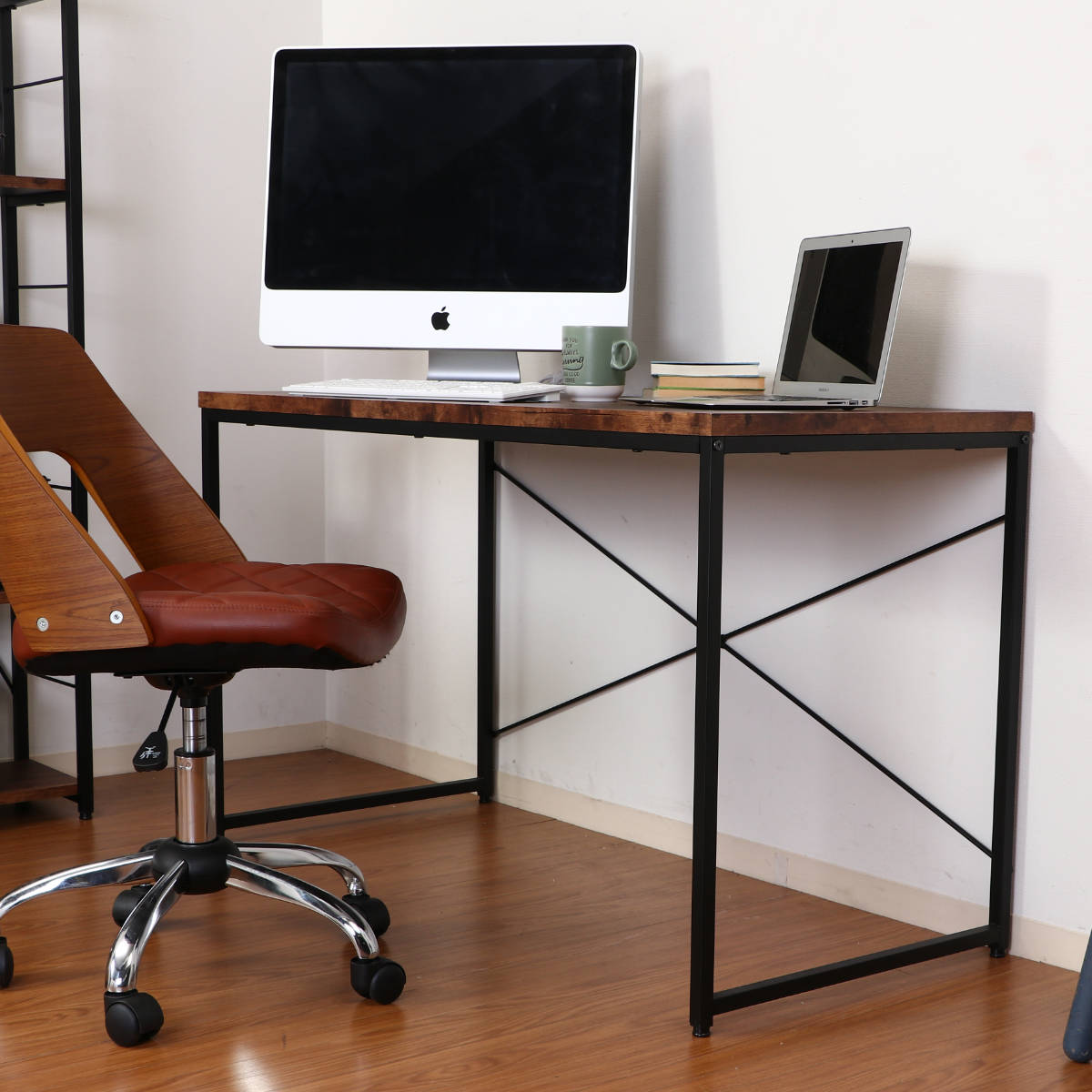 ■ワークデスク 幅120cm パソコンデスク ヴィンテージ調 ( 天板 広い デスク パソコン 2台置ける 勉強机 木目調 スチール脚 異素材 長方形