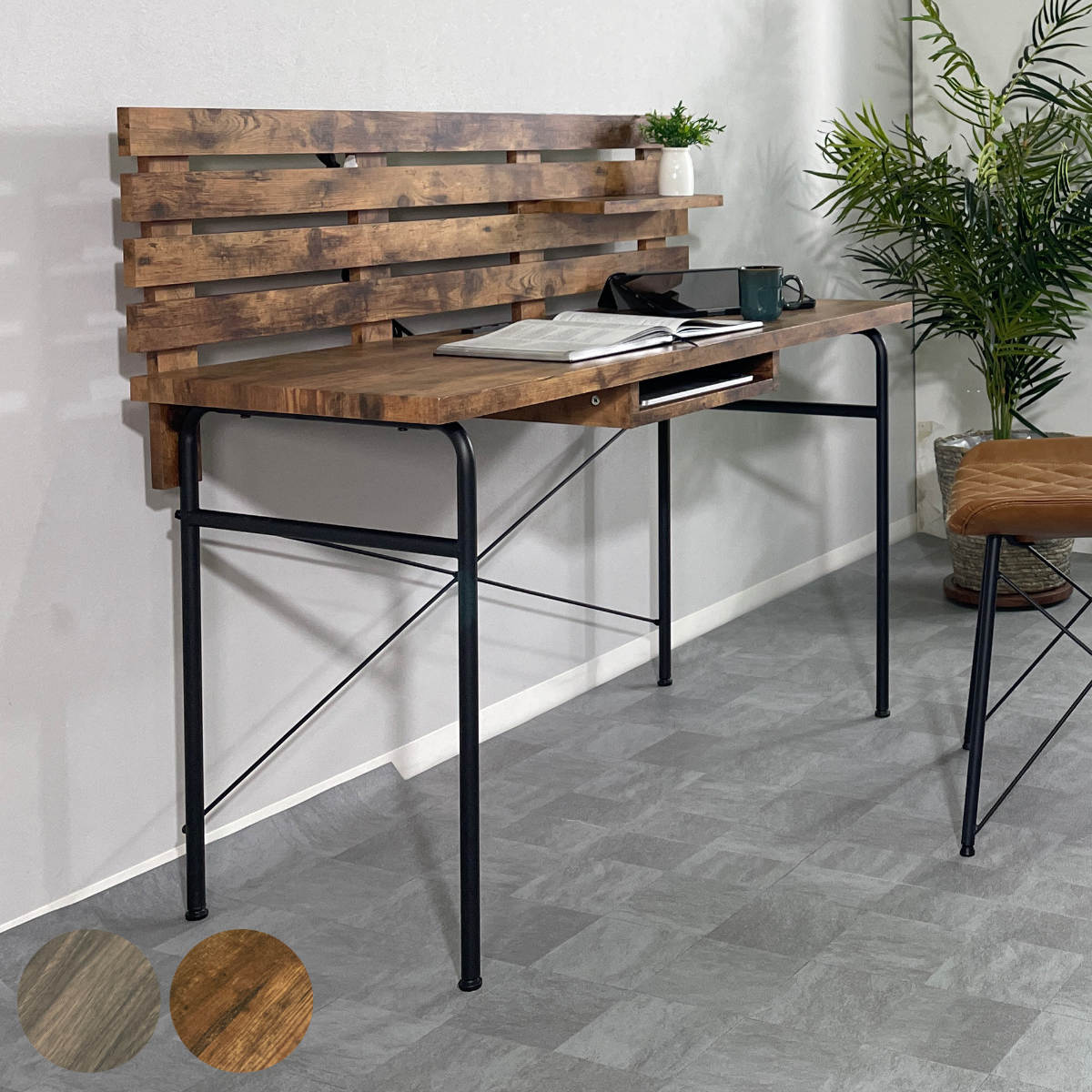 ■ワークデスク コンセント付き 収納棚 木目調 幅120cm ( デスク PCデスク パソコン 机 リビング 書斎 大人 異素材 おしゃれ ヴィンテージ