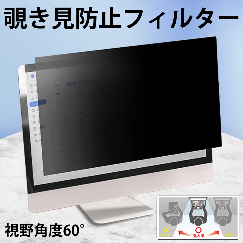 ★「対応機種」 19Wインチ(16:10)408mm×255mm、20Wインチ(16:9)443mm×250mm、21.5Wインチ(16:9)477mm×268mm ★「商品特徴」 ビジュアルハッキング対策!タッチパネルにも対応した、のぞき見防止フィルターです。 移動中や出張先でも周りからの視線を防いで安心してパソコン操作ができる、のぞき見防止フィルター です。 画面の正面を中心に60°(左右30°)より外の角度からは画面がまっ黒に見えるので、パソコン画面を見られる心配がありません。 ★「キーワード」 のぞき見防止 フィルター 保護フィルム モニター ノートパソコン デスクトップパソコン 視認角度60°紫外線カット 表面反射を軽減する 硬度3H キズ防止 取り外し 可能
