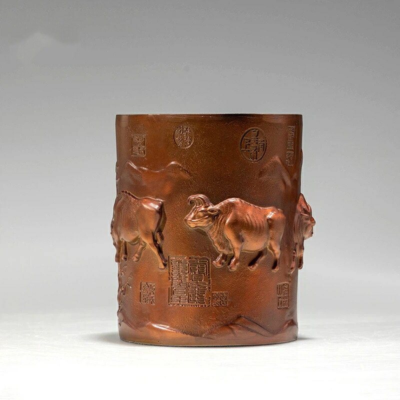 ■五福牛 ペン立て 黄銅 置物 牛 彫刻 工芸品 書斎 オフィス デスク 飾り 開運 勉学 成功 商売繁盛 縁起物 ギフト 贈り物 同僚 友人 卒業祝