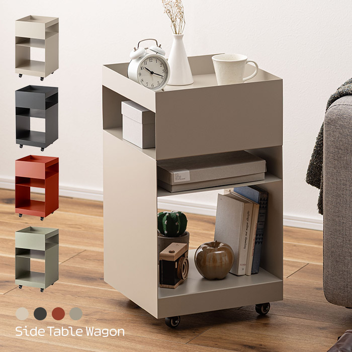 幾何学的デザイン×機能性。オープン収納たっぷりのスチール製サイドテーブルワゴン。 直線のスチールを組み合わせた幾何学的デザインがスタイリッシュで、モダンな現代アートのような、オープン収納のスチールワゴンです。 薄型スチールの4段のオープン収納は、デッドスペースをなくしたデザイン。 耐荷重は20kgと頑丈で、デスクやリビングのアイテムをたっぷり収納できます。 お気に入りの雑貨をディスプレイしたり、マグネットフックを活用しても。 360°キャスターは引き寄せたりなどの移動はもちろん、回転させれば、収納のどの面へもアクセスしやすく、スムーズに使えます。 幅約35×35cm、高さ約62.5cmの大きすぎず小さすぎないサイズ感は、デスク下などに収納しても邪魔になりにくく機能的に使えます。 ベージュ、ダークグレー、オレンジ、ペールグリーンの4カラーをご用意致しました。 ボビーワゴンやHAYなどの名作収納家具からインスパイアされたデザインと実用性で、ソファサイドやベッドサイド、デスク周りをセンスよく彩ります。