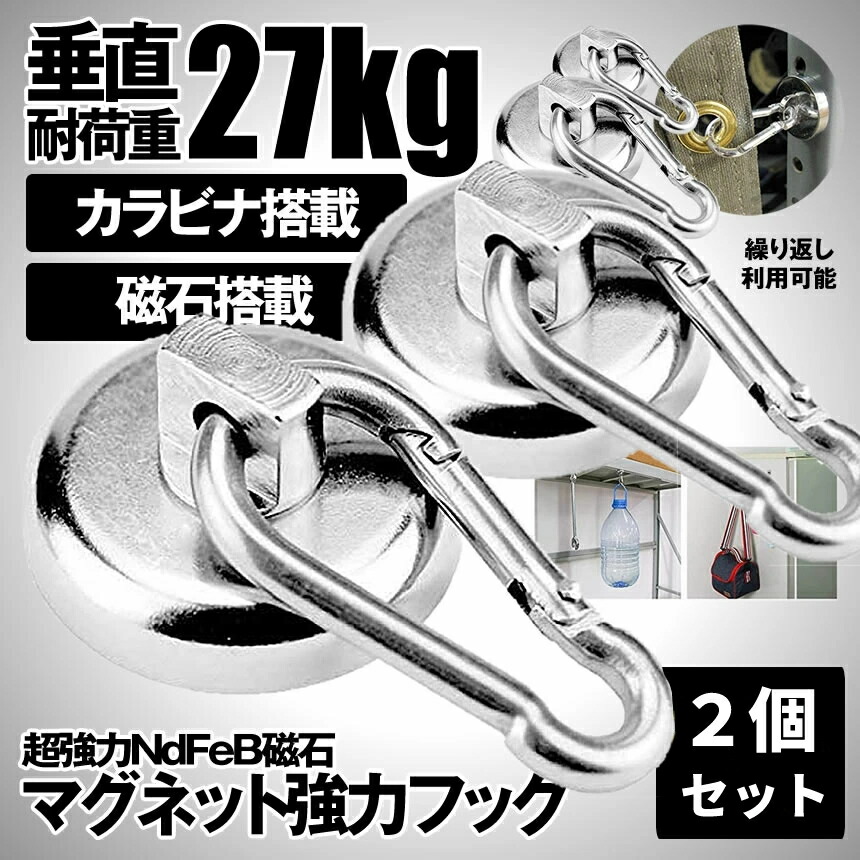 ■マグネット フック 強力 磁石 カラビナ 2個セット 垂直 耐荷重 27kg キッチン 冷蔵庫 倉庫 屋外 取り外し 可能 収納 片付け カバン マグ