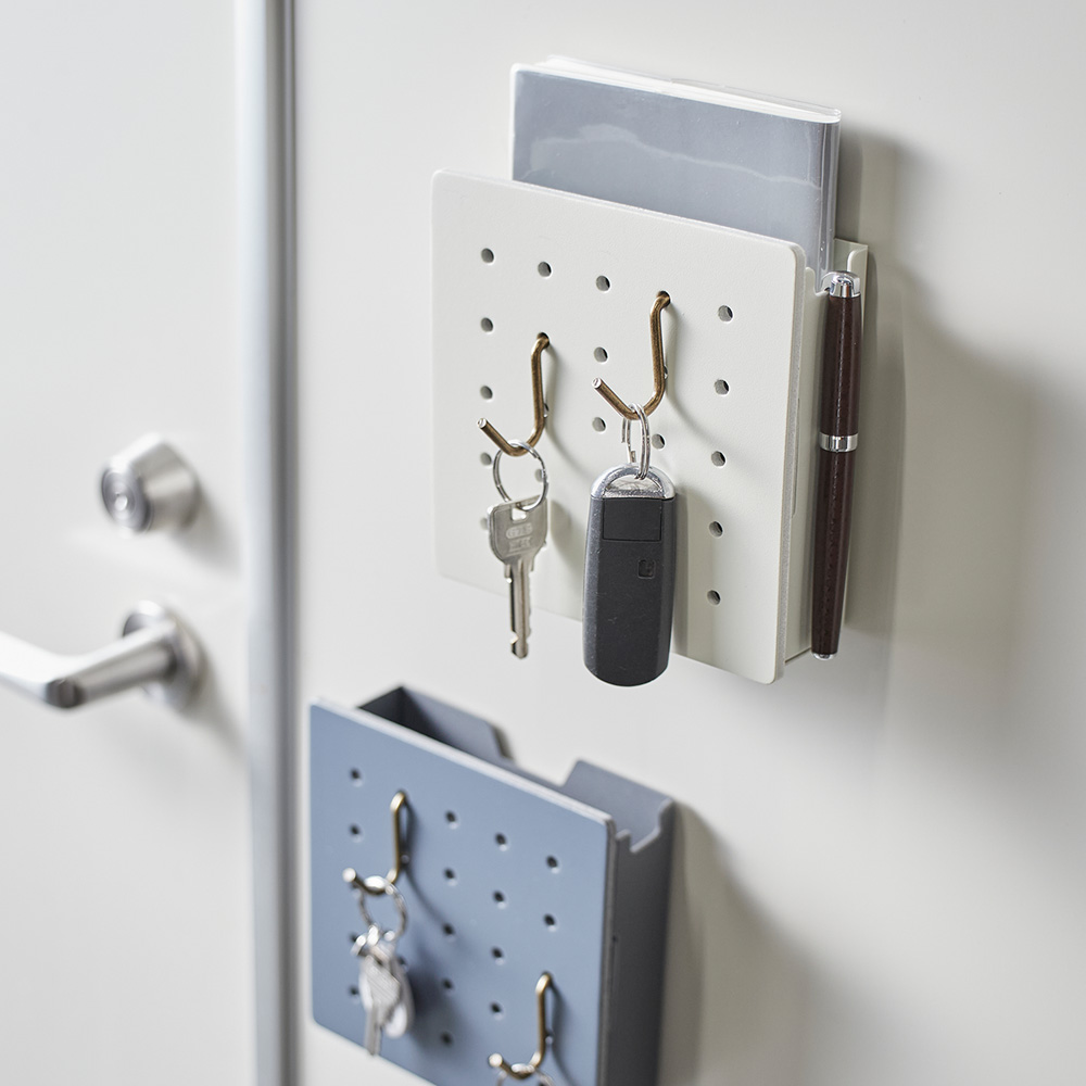 本体裏にはマグネットが付いているので、金属面に貼るだけで簡単に設置ができますネジ留めがいらず、工具無しで取り付けられるので、取り外しや場所の移動も簡単です玄関扉や冷蔵庫など、ご家庭内での使用をはじめ、オフィスのロッカーやキャビネット、金属製のパーティションなどに貼り付けてお使い頂けますフックで掛けられない物はペグボード扉の内側のスペースに収納可能