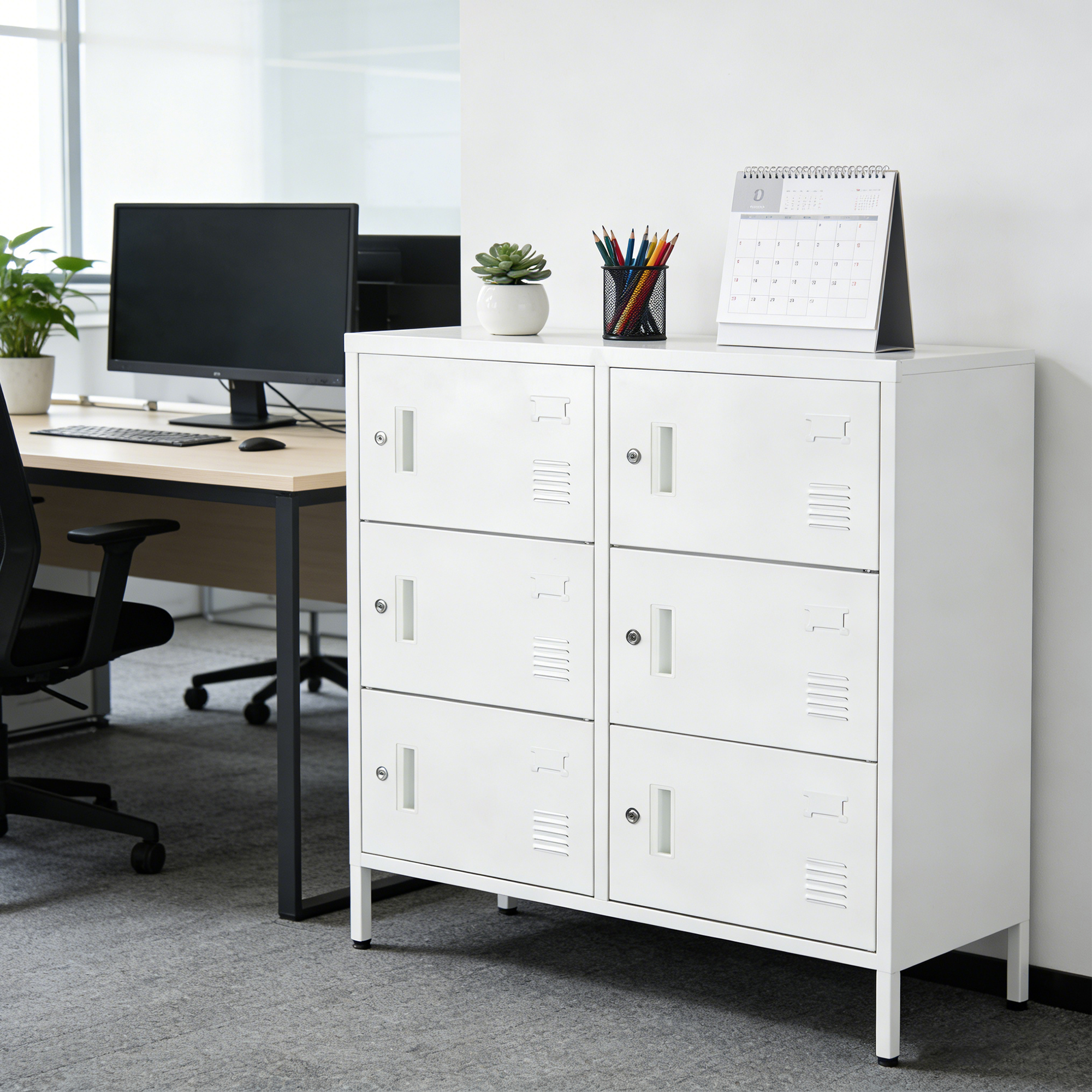 【オフィスの収納課題を一括解決!】このスチール製ロッカーで、整然とした作業環境をつくり上げ、業務効率を最大限に引き上げましょう。【耐久性と実用性の高いスチールワゴン】安定感抜群で頑丈なスチール素材を使用。耐久性と実用性の高い「スチール製」を選びましょう。耐荷重も大きいので、サイドデスクとしても使用することが可能です。【各扉2本鍵付き、プライバシーを厳守】各扉に本鍵1本と予備鍵1本を標準装備し、物品の安全を二重に保障します。精密なロックコアにより開閉がスムーズで、機密書類、ノートPC、プライベート小物など、貴重品も安心して保管できます。本鍵 + 予備鍵付属でプライバシー・物品を二重保護。予備鍵管理でトラブル対応もラクラク、業務に支障なし!【科学的レイアウト、収納性と実用性を両立 】合理的な分区レイアウトで、1扉あたりの収納容量に富み、A4ファイル、オフィスバッグ、靴など多様なオフィス用品や個人アイテムを余裕で収納できます。名札ホルダー搭載:個人識別バッチリ!通気スリット付き扉:湿気を逃がしカビ・異臭を防ぎ、高湿環境でも OK!ストレスフリー開閉:3.握りやすい形状の取っ手が特徴!力を入れ