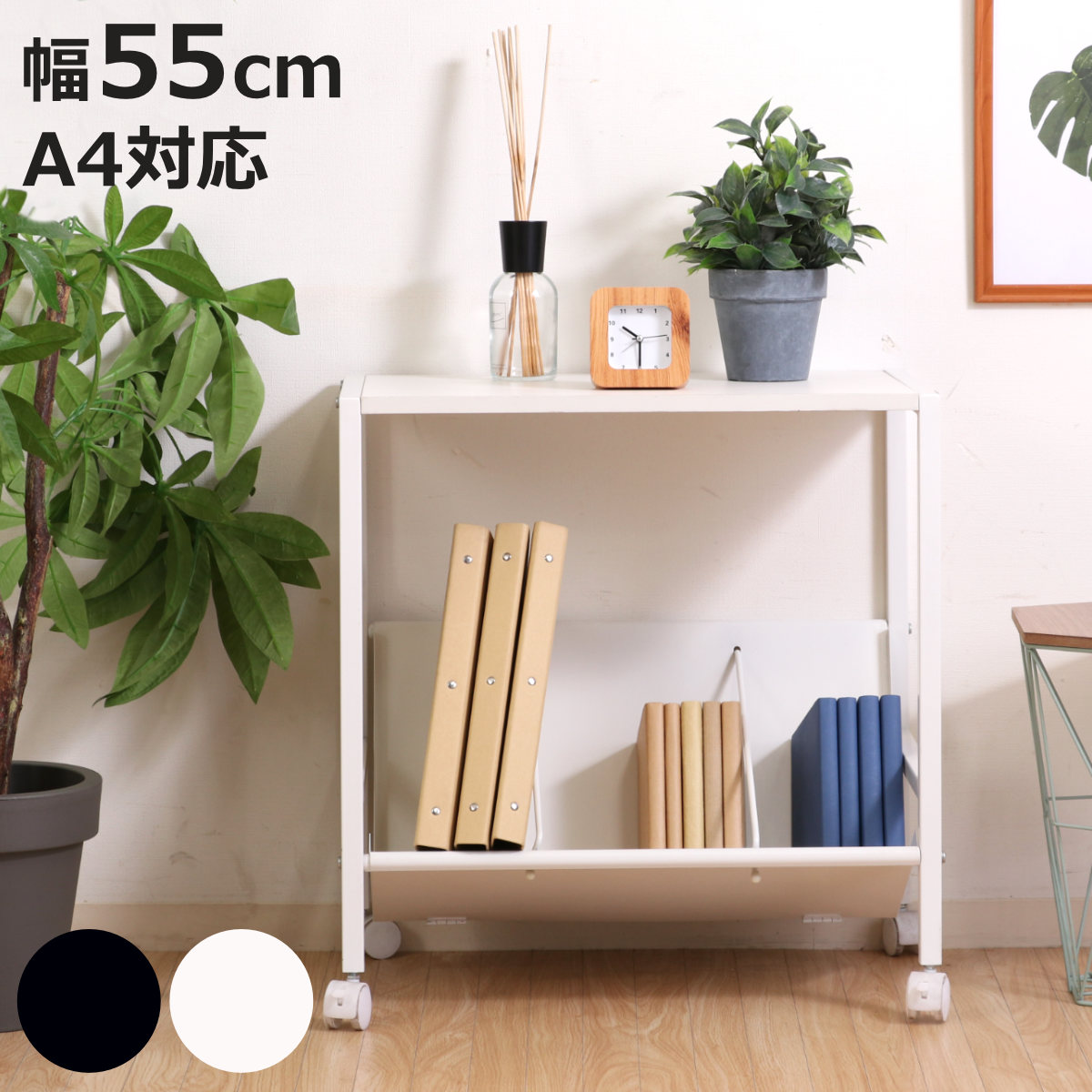 ■ファイルワゴン 幅55cm 1段 キャスター付 ( ワゴン A4対応 書類 ファイル 収納 ブックエンド付 ファイルラック 棚 ラック 斜め 本棚 机