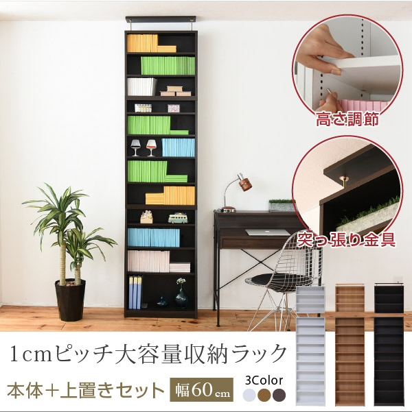 ■文庫本ラック 本棚 薄型 大容量 幅60cm 上置きセット 1cmピッチ 壁面収納 つっぱり 木製 本収納 漫画 CD DVD jk-yhk-0214set 店舗 カフェ
