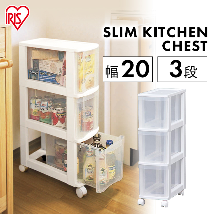 クローゼットやキッチンなどの、ちょっとしたすき間を活かせる幅20cmの3段チェストです。移動に便利なキャスター付き!