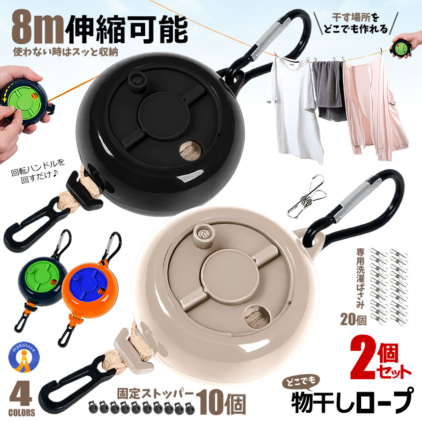 ■2個セット 物干しロープ 8m 伸縮式 巻き取り式 洗濯ロープ ストッパー付き 洗濯物 ランドリー 時短 海外旅行 NEWROPE