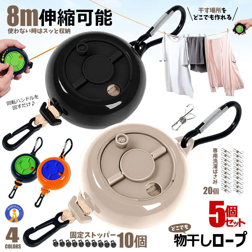 ■5個セット 物干しロープ 8m 伸縮式 巻き取り式 洗濯ロープ ストッパー付き 洗濯物 ランドリー 時短 海外旅行 NEWROPE