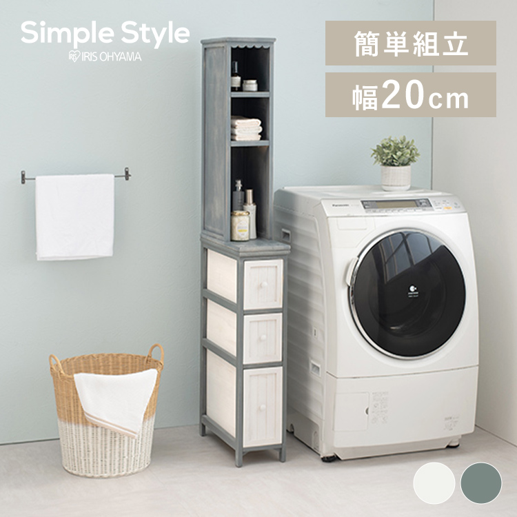 ■商品について/うっすら木目を生かしカントリーチックに仕上げたランドリーラックシリーズ。鉄製トランク取っ手、アーチ状の台輪部など、細部にこだわったお洒落なシリーズ。省スペースで使える奥行約30cmで、限られた空間に収納機能を凝縮。下着やヘアワックスなどコスメの収納に便利なチェストタイプ、詰め替え用のシャンプーやビッグサイズの柔軟剤、バスタオルなどストックに最適なストッカータイプ、ストッカーに更に収納量増しの上置き付きタイプと3種をご用意。■商品の仕様/本体:強化プリント紙化粧繊維板■商品サイズ/本体:(約)幅30×奥行30×高さ89cm■引出内寸/(約)幅23.5×奥行24.5×高さ10.5(有効14・14.3・12.5・14.3)cm■耐荷重量/天板:(約)10kg■商品重量/(約)15kg■中国製■組立品