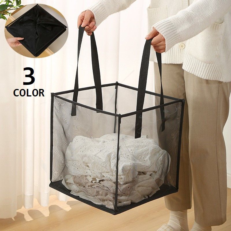 ■ランドリーバスケット 四角形 折りたたみ 洗濯かご 脱衣かご 持ち手付き 洗濯物入れ 収納 メッシュ スクエア型 折り畳み 生活