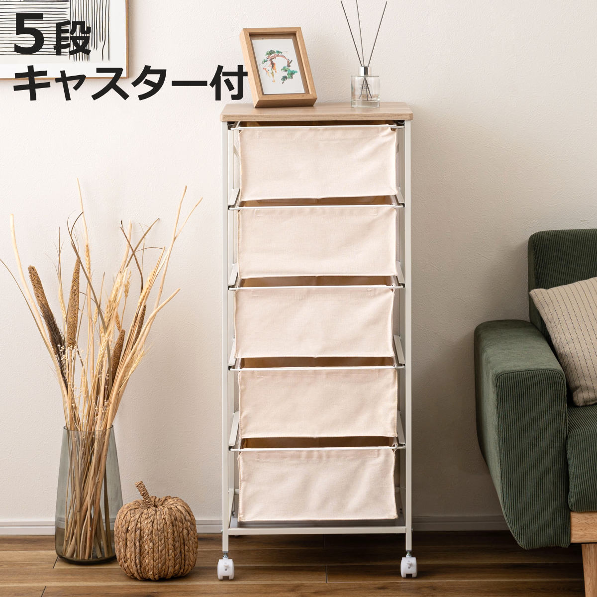 ■チェスト 5段 キャンバスチェスト キャスター付き 木製天板 ( 引き出し キャンバス地 軽量 収納 ラック 棚 タンス 衣類収納 ランドリー