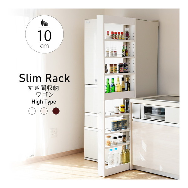 ■隙間収納 幅10cm キャスター付き キッチンワゴン スリム 収納 洗面所 ランドリー 木製 すき間 ワゴン ハイタイプ ホワイト 白