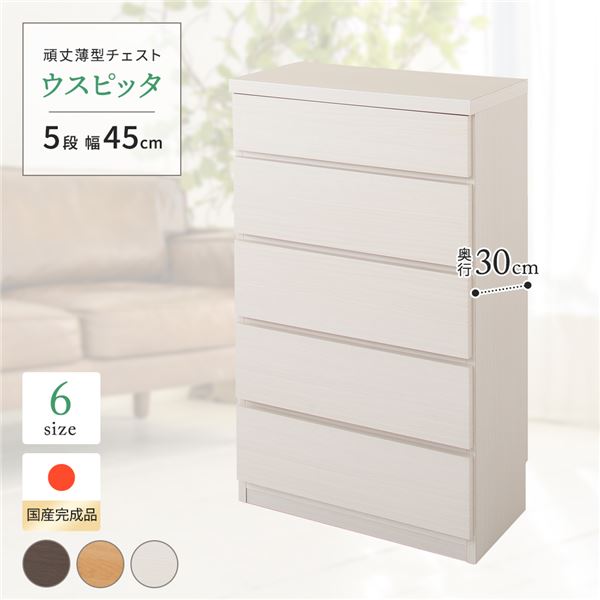 ■高い耐久性 頑丈 薄型チェスト タンス キャビネット /整理 収納 棚 【5段 幅45cm ホワイト木目調】 奥行30cm 日本製 国産 『ウスピッタ』