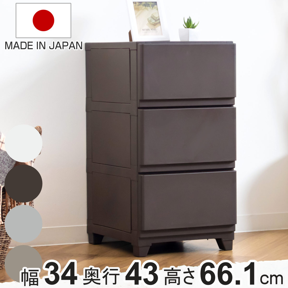 ■チェスト 壁付 デコニーシーヴォ 3段 幅34×奥行43×高さ66.1cm ( 収納ケース 引き出し 収納 スリム タンス 衣装ケース 日本製 プラスチ