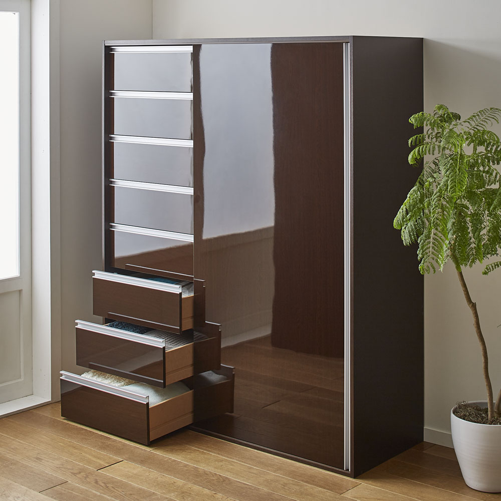 美しい光沢仕上げに引き出しとハンガーラックをプラスした大容量クローゼット収納。 洋服や下着など衣類に合わせてまとめて収納出来ます。引き戸仕様で簡単に隠せるのも魅力の一つです。お客様からのご要望にお応えして、幅150cmを追加しました。
