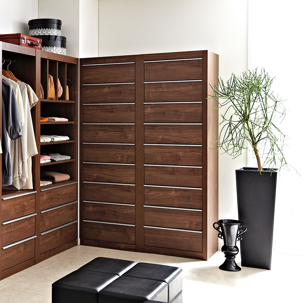 高級感と重厚感を醸し出す、クラシックやホテルライクなインテリアを感じさせるウォールナット無垢材調の国産クローゼット収納。洋服・バッグ・衣類小物までをまとめて収納できるユニット式の大量収納ワードローブです。シンプルなデザインながら上質感のある厚みのあるフレームを使い、ヨーロッパや北欧のウォークインクローゼットのような空間を簡単に叶えます。引き出したくさんの9段タワーチェストで、大量収納が叶います。オフシーズンアイテムは上段に、普段使用する服は手に届きやすいところになど、区分けすることで衣類の管理がスムーズに。