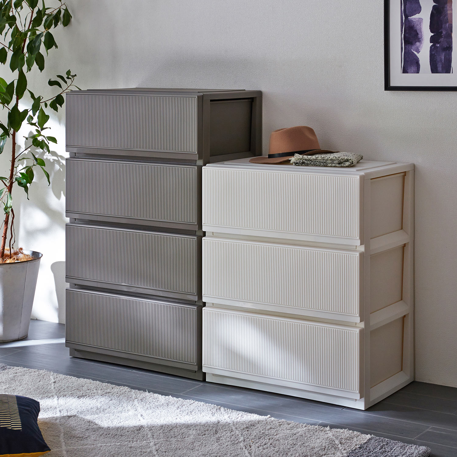 インテリアに馴染みやすいスタイリッシュな佇まいの衣類チェストルーバー風の前板がシンプルな中にニュアンスを与えるおしゃれなデザインリビングや寝室、サニタリールームなど幅広いシーンで大活躍天板にはアルミ補強板を入れ、たわみにくいから小物をディスプレイするのもオススメ引出しは厚手の衣類もしっかり収納できる深型タイプ引き出しやすいつくりなので、たっぷり収納しても開け閉めラクラク隠しキャスター付きで移動もスムーズです#引き出し収納#引出し収納#衣類収納