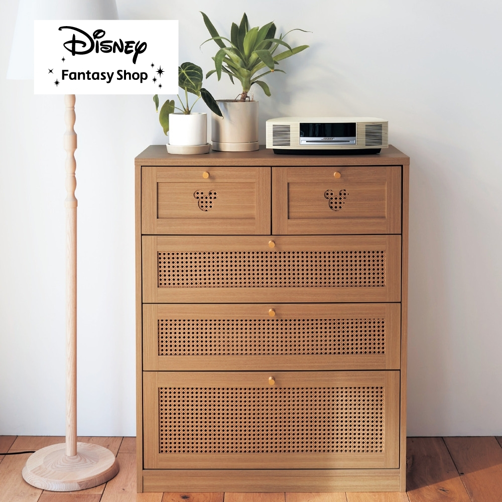 ーデザイン・スタイリングー・新しさと懐かしさに惹かれるラタン調チェスト・ゴールド調取っ手や前板枠が洗練のデザイン・衣類収納はもちろんリビング収納にも◎・鏡板にあしらったミッキーモチーフがポイントー素材ー・ラタンに見えて実はお手入れしやすい樹脂素材・前板の通気性がよくランドリー収納としてもー機能ー・2段目以下は開閉しやすいスライドレール付き・浅引出しと深引出しの組み合わせが収納しやすいD-STANDARD上質なものと暮らしたいけど、価格はやっぱりお手頃でなくちゃ。デザインにはこだわりたいけど、使い勝手の良さも大切。そんな欲張りな思いに応えるのがD-STANDARDのアイテムです。テーブルやソファーといった大きな家具からインテリア雑貨、ファッションにいたるまでアイテムは充実。いろいろなシーンであなたの心地よい暮らしをお手伝いします。