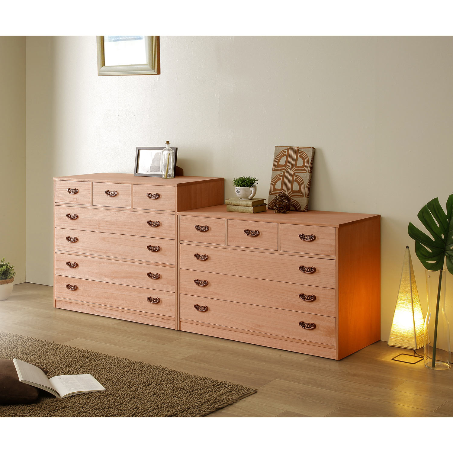 前板に上質感たっぷりのアルダー材を使用し、自然オイルでナチュラルに仕上げた衣類チェスト大小の引出しで整理しやすく、大引出しは軽い力で出し入れできるスライドレール式になっています省スペースで置けるサイズから大容量サイズまで、お好みに合わせて選べる8サイズ展開明るい「ナチュラル」とシックな「ダークブラウン」の2色から