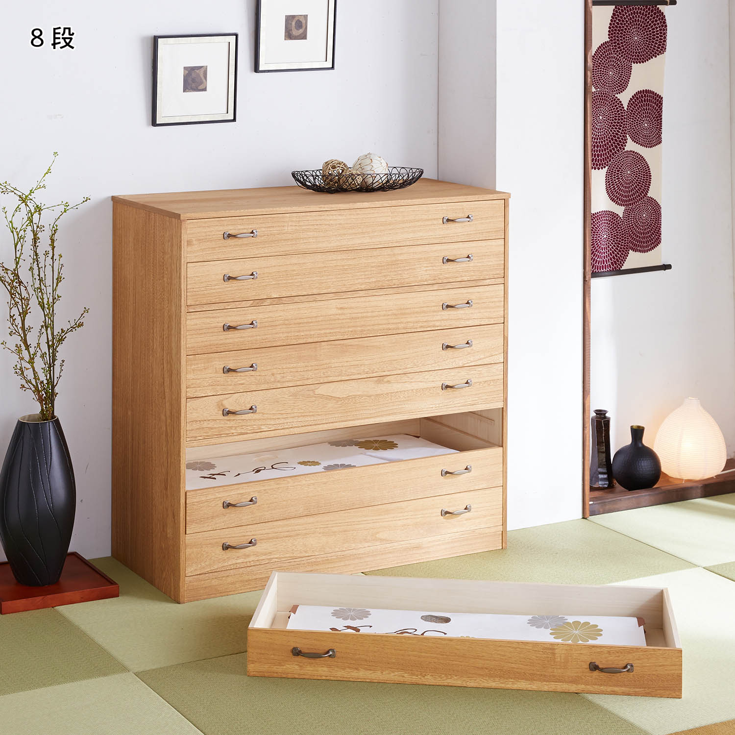 調湿、防虫、防腐効果に優れた桐をふんだんに使った総桐チェスト木目を浮き上がらせる浮造り(うづくり)仕上げの風合いと、洋ダンスなどにも使われるデザインの取っ手を組み合わせで、洋室でも使いやすいおしゃれなデザインですたとう紙がすっぽり収納できるサイズなので、着物や浴衣の収納に便利引出しは上下自由に入れ替えられ、衣替えも簡単です「4段」「6段」「8段」タイプからお好みで