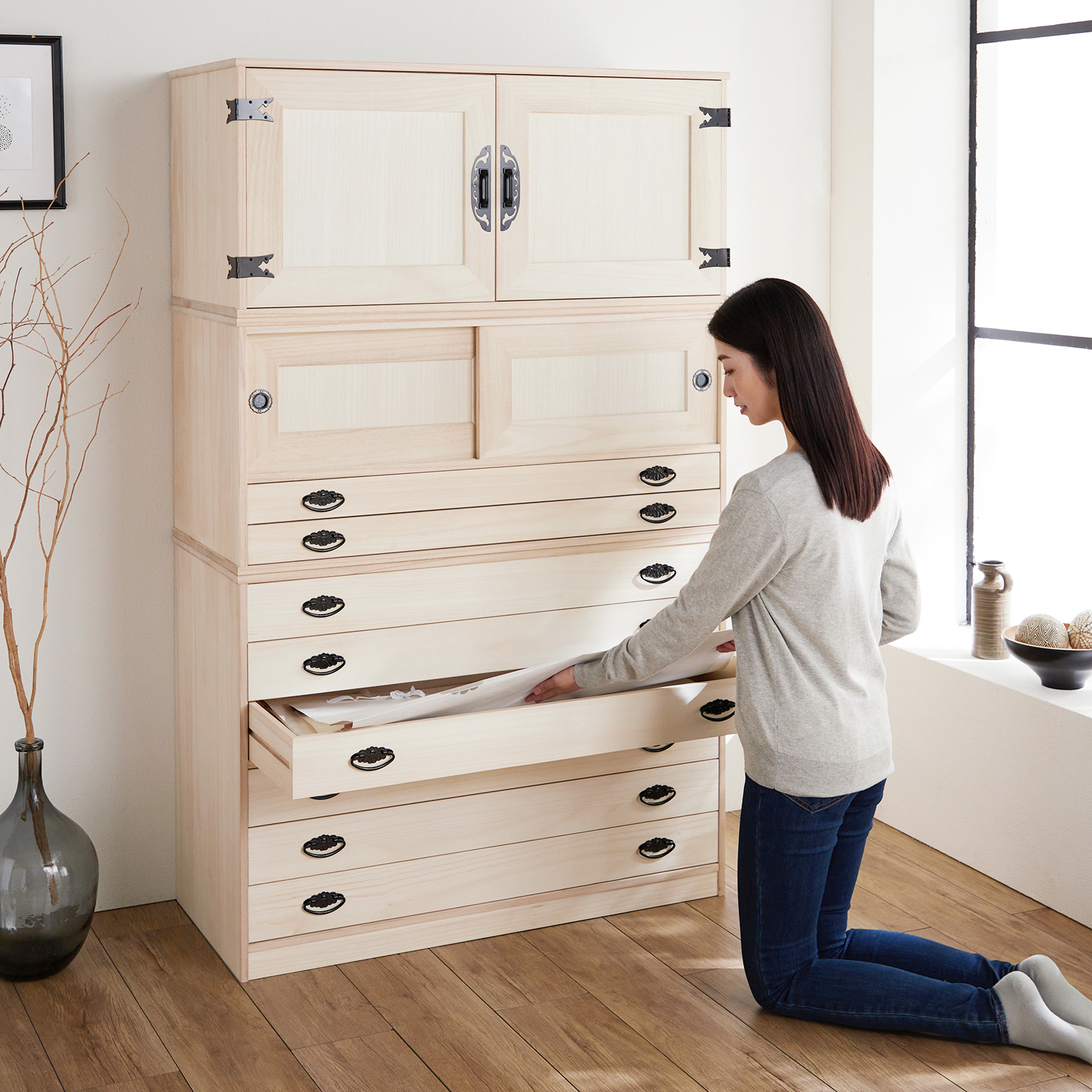 調湿効果・防虫効果の高い桐材の衣類チェスト大事な着物や洋服などを湿気から守ります民芸調になりがちな桐チェストを現代風にすっきりとアレンジ引戸、扉盆、チェストを収納物に合わせて組み合わせてオリジナル仕様の「整理たんす」が作れます引出しタイプは畳の上に設置しても最下段が干渉しない幕板付き桐そのものの良さが味わえる蝋引き仕上げです
