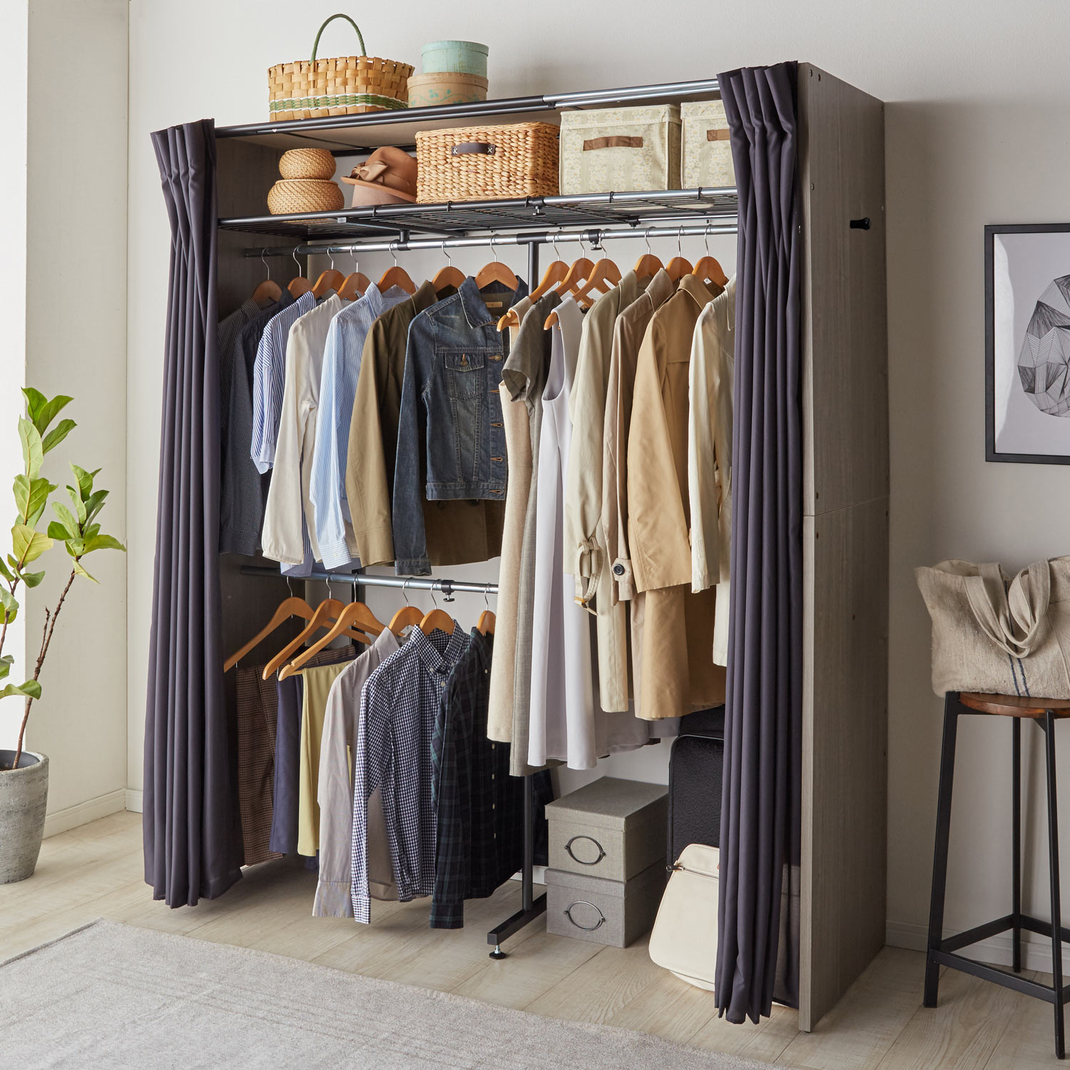 スペースや収納量に応じて幅を伸縮できるクローゼットハンガーですきれいな木目調のシートを使用し、くすんだカラーが空間におしゃれにマッチ上下2段のバーに、トップスとボトムスを分けて収納できます片側のバーにはコートやワンピースなど長物もOKカーテン付きなのでほこり除けや目隠しにもなりますカーテンはやや透け感があり、上品でインテリアを損ないません棚付きタイプは、上部の網棚に帽子やバッグなどを収納できます