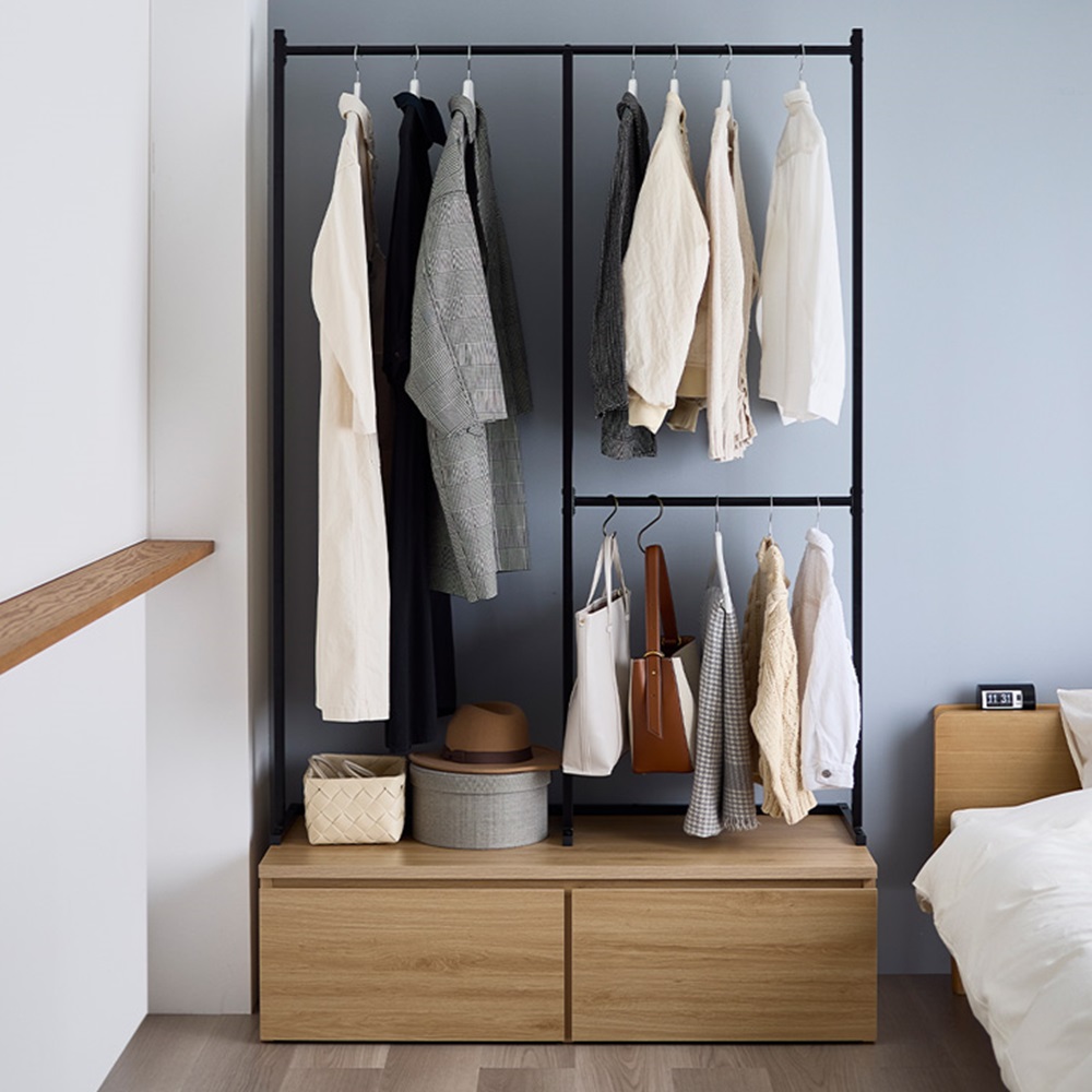 ーデザイン・スタイリングー・見えても絵になるインテリア性の高いスタイリッシュなデザイン・服の収納場所が少ないというお悩みを解消・寝室や空き部屋を整理したい方にもおすすめー機能ー・上下のハンガーバーとワゴンで、服、バッグ、小物をまとめて収納・高さがあるからコートやワンピースなど丈の長いものもOK・下段のハンガーバーにはバッグやスカーフが掛けられて便利・小物や書類もたっぷりしまえるワゴン付き・ワゴンはキャスターで引き出せるから出し入れしやすい・ワゴンはオフシーズンの小物の収納場所にもおすすめ・ワゴンの天板の上にもバッグやシューズボックスが置けるー素材ー・アイアンと木目柄の組み合わせベルメゾンデイズ/BELLE MAISON DAYSベルメゾンデイズ は、「今日より明日、明後日が楽しくなる暮らしの提案」をコンセプトとした、ベルメゾンを一歩リードするオリジナルブランドです。どの商品を組み合わせても居心地の良い 美しい空間がつくれるように考えられています。