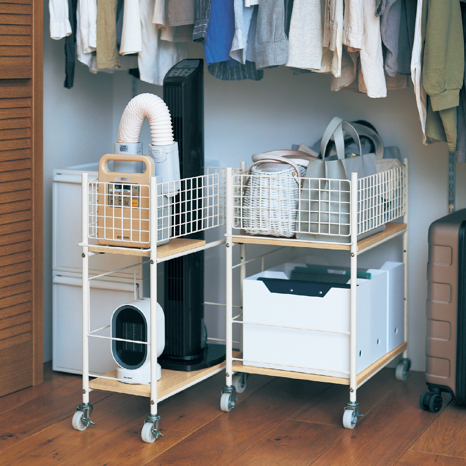 ーデザイン・仕様ー・押入れやクローゼットの中をすっきり片付けられるワゴン・しっかりとした作り & すっきりデザイン・オフシーズンの家電や日用品のストックの収納に・おむつなどのベビー用品やおもちゃの収納に・学用品を収納してデスクサイドワゴンとして・キッチンでストック類やサブ家電の収納ワゴンとしてもー機能ー・出し入れしやすいキャスター付き・ベアリング付きで旋回しやすいキャスターだから動かしやすい・使う場所までゴロゴロと引き出せて便利・上段の棚板は置くだけの仕様で簡単に取り外しOK・上段はハーフ棚になっているので、収納物に合わせて取り外し可能・上段のハーフ棚を外せば、タワー型扇風機などの背の高い家電も収納しやすい・下段のサイドフレームは設置場所や利き手に応じて簡単に付け替えできます・選べる豊富な9タイプ展開#押入れ収納 #クローゼット収納 #ベビー用品収納#おもちゃ収納 #おもちゃワゴン #学習用品収納ラック #ランドセルラック