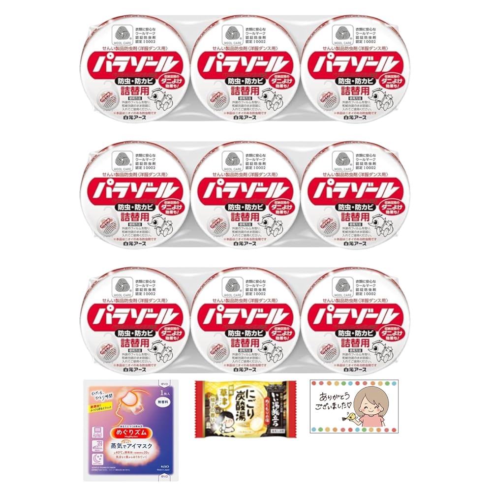 「商品情報」パラゾール 洋服ダンス用 詰替用は、大切な衣類を虫害から守る防虫剤です。 有効成分がタンス内に行き渡り、衣類の虫食いやカビの発生を防ぎます。 詰替用3個入りで経済的に使え、長期間効果が持続します。 洋服ダンスやクローゼットに吊るすだけの簡単設置で、 衣替えのシーズンや長期保管時にも安心。 さらに本セットにはアイマスク・入浴剤・SHOPカードが付属し、 防虫対策だけでなくリラックスタイムにもお使いいただけます。「主な仕様」『洋服ダンス用防虫剤』衣類を虫害から守ります。 『詰替用3個入り』経済的で長く使えます。 『長期間効果持続』シーズンを通して安心。 『簡単設置』吊るすだけで手軽に防虫。 『カビ防止』湿気の多い季節にも衣類を守ります。 『省スペース』クローゼット内で邪魔にならない形状。 『アイマスク付』快適な睡眠サポート。 『入浴剤付』リラックスタイムに最適。 『SHOPカード付』便利なおまけ付き。 『衣替えに最適』長期保管前におすすめ。