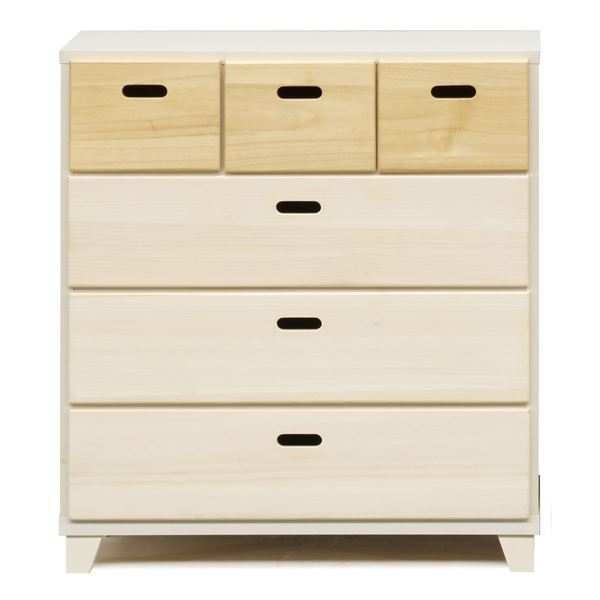 引き出したくさんで小分け収納が可能な多段チェスト。整理整頓は勿論、衣類・下着類の型崩れもしにくく快適な衣類管理が可能に。衣装持ちさんやおしゃれなランジェリーを集めている方にぴったりな洋服タンスです。大切なお洋服を守るための機能性や衣替えのしやすさもポイントです。整理整頓しやすい引き出したくさんの多段チェストどんどん増える衣類と下着類。大きな衣装ダンスはたくさん物が入って便利ですが、分類収納が大変で中身がごちゃつくことも。そのためには初めから小分けされた引き出しが便利。引き出しごとに分類収納すれば、中身がきれいに整理されるだけでなく、衣類や下着類の型崩れもしにくく一石二鳥です。シンプルな外観とトレンドのシックなカラーに、収納物に配慮した機能性が魅力の衣類収納チェストです。分類収納も楽々。下着やランジェリー類の型崩れも防ぐ引き出しのサイズがこだわり■向かって右側の幅の狭い引き出しは内寸がおよそ27cmでランジェリーがちょうどよく収まる幅サイズに。■お気に入りの下着は型崩れさせず大事にしまっておきたいもの。綺麗に重ねて並べれば安心に収納できるのでおすすめです。■そのほか、幅の狭い引き出しは靴下やショーツ、キャミソールなどのインナー類の収納にお勧めです。季節や色、家族それぞれの物を分類すれば管理も簡単です。収納物に配慮した、こだわりの機能性で衣類を大切に守ります■引き出し内部は清潔感のあるホワイトカラーで化粧を施し、収納物に配慮しました。■本体の地板は奥までしっかり幅を持たせることで、収納した衣類の引っ掛かりを軽減。本体の強度をより高める効果も。■引き出しには開閉・出し入れがスムーズなコロ付きスライドレールを採用。■コロ付きスライドレールは引き出しの取り外しが簡単なのが魅力。■幅が同じ引き出しはすべてサイズが共通なので、引き出しごと入れ替えて、オフシーズンのアイテムもスムーズに衣替え。大容量の収納力で、手持ちの衣類をまとめて収納。選べるサイズバリエーションも魅力。■設置した居場所・お手持ちの衣類に合わせて選べる6種類のサイズバリエーション。■本体奥行き45cmのたっぷりとした大量収納でこれ一台で畳みものの衣類と下着類をまとめて収納が可能です。トレンドインテリアから定番まで。シンプルデザインでもおしゃれに決まる3色のバリエーションチェストらしいシルエットやサイズ感はそのままに、おしゃれなインテリアスタイルを損ねないカラーバリエーションでご用意しました。なりたいお部屋のスタイルや、お住まいのお部屋の内装に合わせてお選びいただけます。ホワイト木目わずかにアイボリー色がかったホワイトカラー。遠目では目立たない程度の木目柄で、壁紙クロスにも馴染む定番のカラーです。圧迫感を感じさせず狭いお部屋・狭い家に設置するのであればこちらがおすすめ。王道のシンプルなインテリアから、北欧インテリア、ナチュラルベーシックなウォークインクローゼット等幅広く活躍するカラーです。グレーウォールナット天然木調ウォルナット柄にわずかにグレーがかったダークブラウン系で、昨今の新築の住宅やマンションに多い建材に合わせたカラー。木目調ながらクールでモダンな印象で、生活感を感じさせないヨーロピアンスタイル・ヨーロッパ風のワードローブやモノトーンインテリア、アンティーク風なワードローブのアクセントとして映えるカラーです。ブラック木目シックな木目柄に黒いカラーで落ち着いた大人な雰囲気。こちらもホワイト木目と同じく、光の当たり具合によってはあまり木目柄は目立たずマットブラックにも見えるお色です。シャープな印象でブルックリンスタイル、ヴィンテージやインダストリアルスタイルなどの個性的なクローゼットを演出できます。和室や和モダンな雰囲気の寝室にもマッチします。信頼と安心の国内工場での生産品の衣類収納箪笥・衣類収納チェスト■国内の職人がひとつずつ丁寧に仕上げた日本製のワードローブ・衣類タンスです。■細部の丁寧な仕上がりなど、国産品ならではの高品質な洋服タンス・衣装ケースをお楽しみください。面倒な組み立てのいらない完成品■組み立て不要の完成商品でのお届けになります。届いたその日からすぐにご使用いただけます。