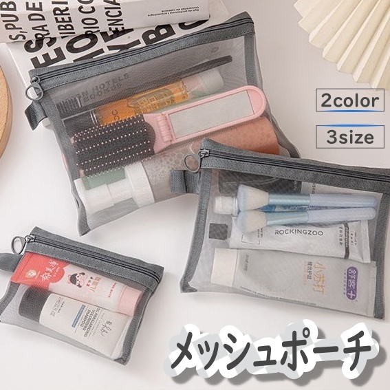 ■コスメポーチ 化粧ポーチ メッシュポーチ 収納雑貨 小物入れ 長方形 通気性 無地 ブラック シンプル 旅行 レジャー 温泉 薄