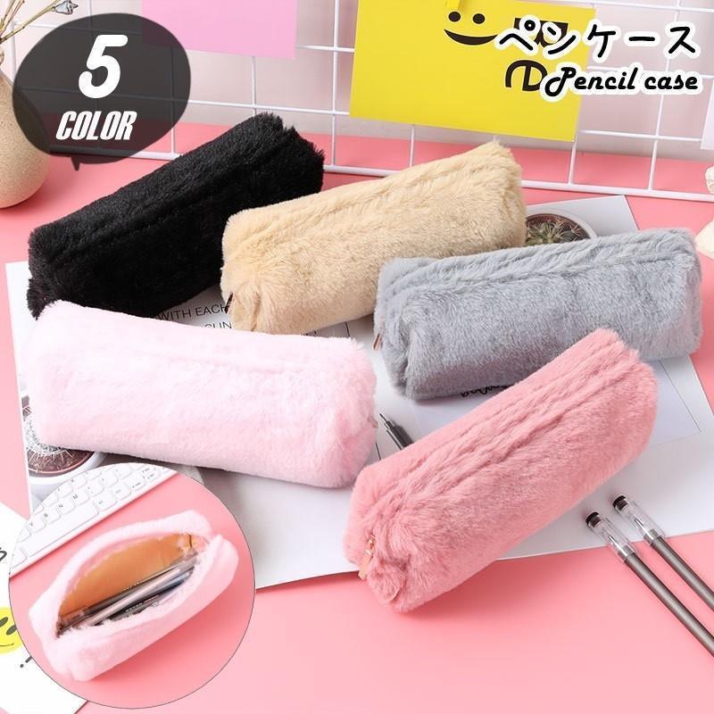 ペンケース 筆箱 ふでばこ レディース 女性 収納雑貨 文房具 長方形 円筒形 チャック ジッパー フェイクファー 無地 グレー ピンク ブラック ふ