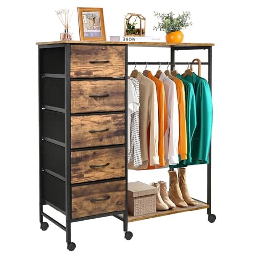 ■ハンガーラック 頑丈 チェスト タンス 5段 木製 キャスター付き 引き出し 棚 収納付き 幅102×奥行40×高さ112CM 衣類収納 2年